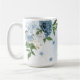 flores românticas azuis e brancas com algumas folhas verdes caneca de café botânico.