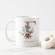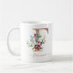 Esta caneca de café botânica de feriado rústica apresenta verde pintado manualmente com bagas vermelhas e letra falsa de ouro F com um nome personalizado em um roteiro moderno, escrito manualmente e em ouro, abaixo do original. Faz um presente encantador para aquela mulher especial na sua vida de Natal. Desenhada por Susan Coffey.