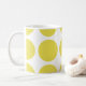 Bonita e tenda Grande Bolinhas Mug. Este design apresenta bolinhas circulares grandes de tamanho excessivo em amarelo e branco. O texto pode ser adicionado a esta design para lhe dar um toque pessoal.