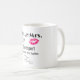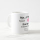 Uma caneca personalizada para um aniversário de casamento com um design de tendências - lábios de kissy cor-de-rosa glamourosos e uma ilustração de bigode retrógrada masculina. Palavras retrógradas dizem que Sr. e Sra. e você pode personalizar com seu nome e anos juntos.