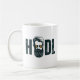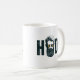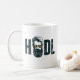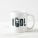 Esta caneca de café Bitmoney apresenta um homem barbudo com olhos Bitmoney e a palavra tipográfica hodl.