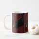 A majestic fluffy black cat with vivid green eyes sits on an authentic, intricately patterned red and black Moroccan Zarbiya (rug), intently focused on a small blue bird. This unique design blends mysterious gothic aesthetics with rich Moroccan Berber/Zellige patterns
