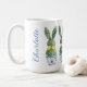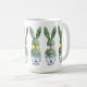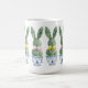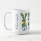 This Easter ceramic mug features cute bunny rabbit green topiaries with pink and yellow bows in blue and white chinoiserie flowerpots. Personalize with your choice of name or special holiday message. Great for Easter baskets and gift bags.