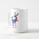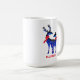 Uma caneca azul ilustrada com um par de cervos azuis escandinavos vestindo lenços vermelhos. Com marcas decorativas em seus corpos.