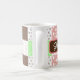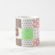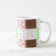 Caneca branca de café personalizada, com bolinhas verdes cor-de-rosa, mauve, castanho, burgundy e sábio e padrões de listras. As cores quentes da Terra.
