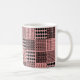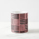Esta caneca tem um design Boho de quadrados com padrões em preto e rosa.