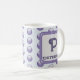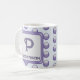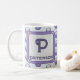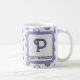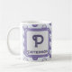 Esta caneca monográfica é uma forma excelente de adicionar um toque personalizado à sua rotina matinal. Um padrão de bolinhas azul aparece contra um fundo azul claro junto com a letra "P" é apresentado em um quadrado junto com o nome da família. A carta e o seu nome podem ser personalizados rápida e facilmente. Design original - C. McGouldrick