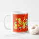 Caneca decorada alegremente em cores vivas e vivas com bolhas e corações e raios de luz para começar o dia no seu melhor humor
