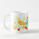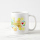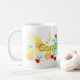 Caneca decorada alegremente em cores vivas e vivas com bolhas e corações e raios de luz para começar o dia no seu melhor humor