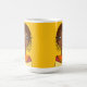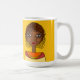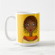 Design colorido, brilhante e abstrato de uma face estilizada de uma menina africana de cabelo encaracolado, com fundo de limão, uma caneca única para casa ou escritório.