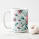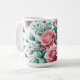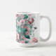 Bonito caneca de café floral com pés cor-de-rosa e folhagem verde.