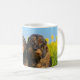 O javali dois adorável coloriu cães de cabelo do dachshund do fio de lado a lado na frente das flores de florescência amarelas da violação. Uma foto engraçada bonito do doggy tomada por Katho Menden. Esta caneca clássica da foto do café branco é uma ideia do presente para amantes do cão. http://www.zazzle.com/kathom_photo