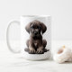 Retrato de um filhote fofo deitado, mostrando seus olhos expressivos e seu olhar atencioso, enfatizando uma presença animadora e carinhosa.