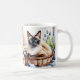 Traga o charme do gato siamês para sua mesa com esta caneca elegante. A caneca é ilustrada com um adorável gato siamês em estilo aquoso, em ambos os lados da caneca. O felino giro se senta em uma cesta mais vacilante por uma janela com vistas no interior, em frente a um vaso de flores azuis. O gato tem pelo macio e olhos azuis gritantes. A caneca bonito é uma adição atraente à cozinha, ideal para amantes de gatos.
