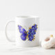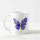 Borboleta de flores cinza, azul, safira, espumante com asa decorada com flores preciosos azuis com folhas de ouro sobre fundo branco.