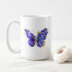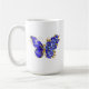 Borboleta de flores cinza, azul, safira, espumante com asa decorada com flores preciosos azuis com folhas de ouro sobre fundo branco.
