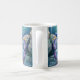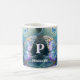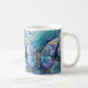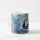 Esta linda caneca personalizada de borboleta azul e roxa vai fazer o presente perfeito para qualquer garota na sua lista - mãe, filha, amiga, professora, vizinha, etc. O design dramático apresenta uma grande borboleta em estilo fantasia em vários tons de azul e roxo com enfeites dourados. As asas da borboleta impressionantemente bonita são refletidas na superfície aquosa onde ela pousa. Ao fundo, há um cenário de nuvens azul-turquesa fofas e em camadas com duas borboletas azuis menores flutuando em torno das bordas. Personalize a área do modelo de texto no centro desta caneca com a letra inicial do monograma e o nome ou palavra de sua escolha. O estilo desta peça é surreal e fantasia. Eu criei esta peça colorida como um presente para minha própria mãe e achei que era bonita o suficiente para compartilhar. Desenhada utilizando arte generativa e minhas próprias habilidades de design gráfico em uma inesquecível manhã de primavera no sul da Geórgia.