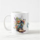 Caneca do templo ocidental, com trabalho de arte adorável de um par de botas e flores coloridas de vaqueira. O texto personalizado teal lê Cowgirl, e pode ser personalizado para ler o que você quer. Excelente de presente para ela.