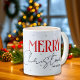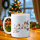 Branch with robin birds and berries Christmas holiday mug. This charming Christmas design showcases a fir branch with berries and redbreast robins on it. The background is of pale blue color. The phrase "Merry Christmas" combines script and decorative fonts. Personalize it with your own name.