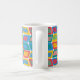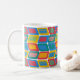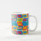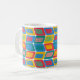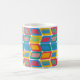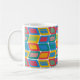 Esta caneca tem uma design moderna do século médio de cores brilhantes que faz retângulos arredondados com outros retângulos dentro formados por uma coleção de linhas.
