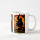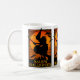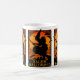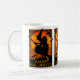 Salem Massachusetts Halloween - bruxa negra sobre vassoura voando através da lua vermelha e laranja de halloween sobre a silhueta negra de Salem.