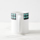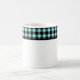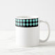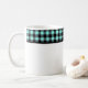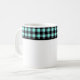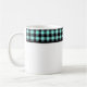 This ceramic coffee mug is shown with a lovely black and aqua color buffalo plaid.