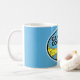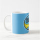 Um adesivo de viagens vintage de Cape Cod Massachusetts reposicionado em uma caneca de café. Este tem um fundo azul. Temos outra disponível numa caneca branca.