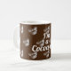Uma caneca marrom de chocolate coberta com um padrão de marshmallow. Ela se vangloria de palavras para amantes de chocolate quente dizendo "Sou um doido de cacau"