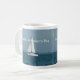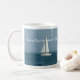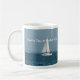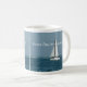 Barco de vela & velas bonito, brancos, em um mar & em um céu do azul, caracterizados nesta caneca legal.
