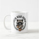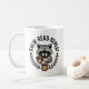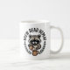 Uma ilustração calorosa, em estilo de crachá, de um guaxinim em um pequeno avental barista lançando café ao lado de uma pilha de livros abertos. A frase "Repetir a Leitura" fica no topo, renderizada em letras amigáveis de blocos e uma matiz marrom-café. Enchimentos de vetor plano e linhas nítidas asseguram que os impressões de trabalho de arte sejam claramente visíveis na cerâmica, enquanto transmitem uma energia aconchegante de leitura e café.