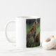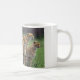 Uma caneca de café cerâmica mostrada com uma impressão de fotografia de um grupo de lindos chitas. Personalize este item ou comprar como está. Imagem do stock