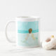 Eu adoro café, praia, e caneca de livros. Lendo na ilustração da praia de um lado.
