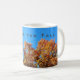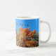 O outono sai contra o céu azul, com a queda por outono. Tipo de letra moderno sobre uma eterno clássica de beleza de outono. Sombras de laranja, amarelo e marrom. Cor castanha para o texto. Visão otimista e encantadora das alegrias da estação do outono e desfrutando da beleza da natureza ao ar livre.