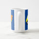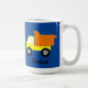 Um belo caminhão de brinquedo. Canecas de café personalizadas. Fundo azul. Edite o nome para personalizar essas canecas. Ideia do presente.