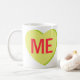 A lime green candy heart that says, "ME."