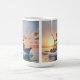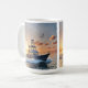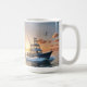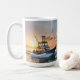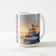 Este produto apresenta um barco de pesca ao nascer do sol ou ao pôr do sol.