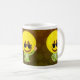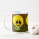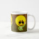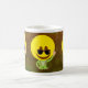 Um rancho engraçado, tonto icônico, dançarino da discoteca de 70 anos, sorrindo chá de bebida quente, cacau ou caneca de café, de tipo amarelo. Este é o copo mais grooviano que já saiu.