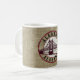 A imagem da caneca de café é um fundo faux burlap com viagem da ponte Mobile Alabama, em silhueta.