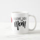 Essa caneca elegante e moderna com o texto, "Eu te amo mãe" é perfeita para sua mãe. Diga-lhe que a ama e que lhe lembre-a toda vez que ela bebe o café ou o chá. Personalize com o nome da criança para torná-lo exclusivo e pessoal.
