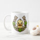 Adicione um pouco de diversão ao seu tempo de café com esta charmosa caneca com um desenho animado sentado em uma ferradura simplificada com sotaques Celta. Uma maneira deliciosa de celebrar a Rua. Dia de Patrick ou se animar qualquer manhã.
