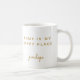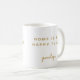Uma caneca de tipografia simples e moderna, branca e dourada, "lar é meu lugar feliz", com nome personalizado.