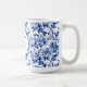 Uma caneca de casamento com um elegante design de toile floral azul e branco.