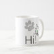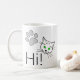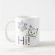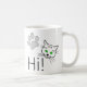 Oi, texto e desenhos de um rosto de gato com olhos verdes e uma pata. Saudações aos gatos. Uma caneca de café engraçada para qualquer um. Personalizável. Você pode mudar a imagem.