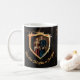 O escudo do Cavaleiro. Casaco de crachá de armas. Crachá de segurança. Ilustração desenhada à mão. Modelo antigo vintage personalizável Mugs & Cups para seu próprio texto e imagem. Perfeito para criar presentes de parabéns individuais / presentes para todos que amam a Idade Média / Idade Média / tópico vibrante. — Visite minha coleção "Medieval" para mais produtos com este design e outros designs únicos excelentes em posters, t-shirts, ornamentos, relógios de parede, adesivos, ímãs e muitos outros produtos populares.