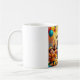 Uma ilustração vibrante e alegre de crianças celebrando Eid Mubarak com balões coloridos, presentes e expressões alegres. Os tons quentes do ouro criam uma atmosfera festiva e convidativa, perfeita para cartões temáticos Eid, posters e designs digitais. Esta trabalho de arte capta lindamente o espírito de união, felicidade e tradição cultural durante a celebração do Eid. Celebração de Eid Mubarak com uma caneca de café vermelho-marrom.