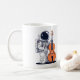 Uma caneca única com astronauta cartunista em um espaço branco tocando um violoncelo laranja-marrom vibrante contra um fundo preto sólido. Perfeito para os entusiastas da música e do espaço!"