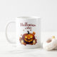 A ilustração mostra uma cena do Dia das Bruxas cheia de abóboras esculpidas.