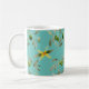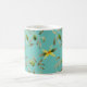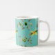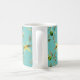 Ceramic mug with an olive, olive leaf and olive blossom design on light teal background.