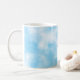 Nuvens brancas no céu azul. Canecas de café personalizadas. Adicione nome ou texto para personalizar. Decoração e ideia de presente.