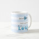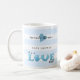Design elegante com um padrão de listras azul e branca, com pontos de confete luminosos azuis e um AMOR com impressões de mão e pés de bebê em azul, um coração azul e uma chamada de nome. Personalize alterando o nome e o texto.